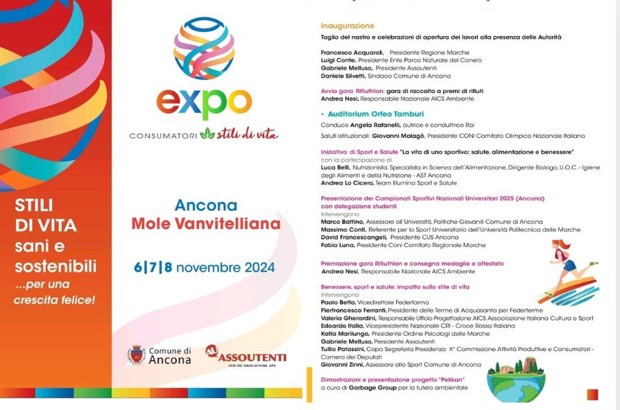 L’evento “Expo Consumatori” 2024 si terrà ad Ancona presso la Mole Vanvitelliana, organizzato da Assoutenti con il tema “Stili di vita sani e sostenibili… per una crescita felice”. L’inaugurazione avverrà con interventi di figure istituzionali come Francesco Acquaroli e Giovanni Malagò.