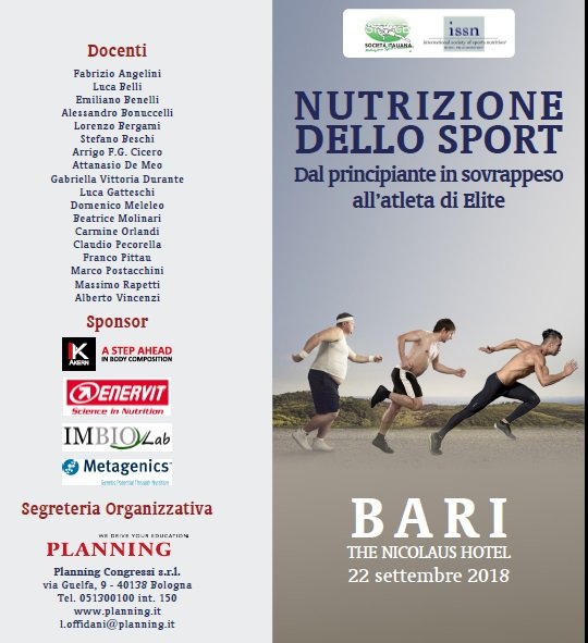 Vi aspetto numerosi al corso della Società Italiana Nutrizione Sport e Benessere " NUTRIZIONE DELLO SPORT: DAL PRINCIPIANTE IN SOVRAPPESO ALL’ATLETA DI ELITE " che si terrà a Bari il 22 settembre 2018.